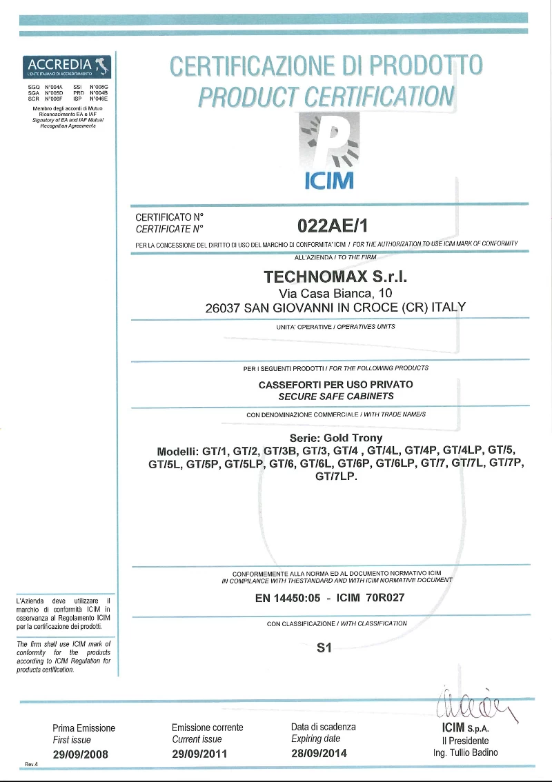 Совокупность этих факторов гарантирует исключительную безопасность хранения драгоценностей, денег и документов Сейфы серии Technomax отличаются превосходным качеством и известны своей надёжностью; об этом свидетельствуют европейский сертификат EN 14450 и российский ГОСТ Р 50862-2012.